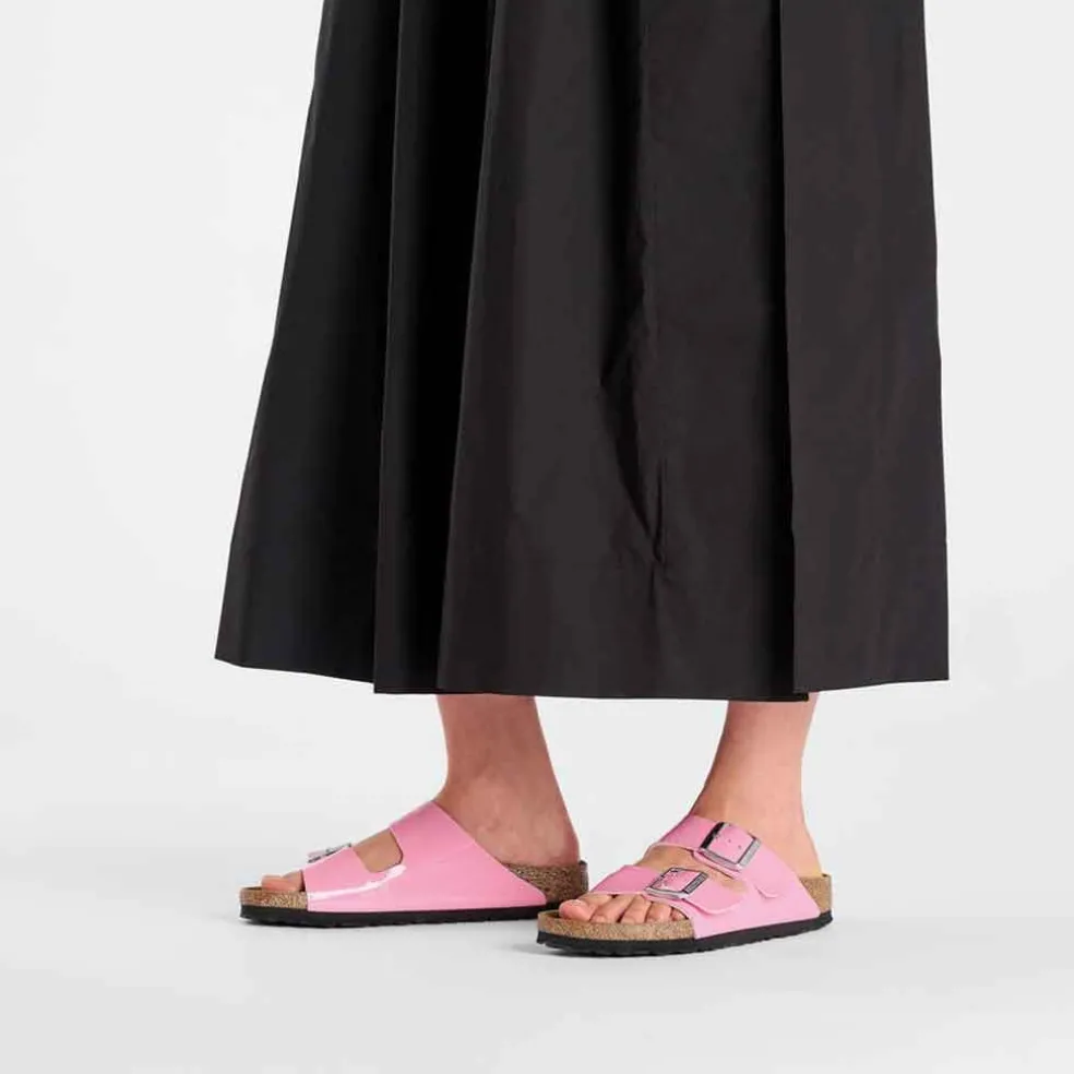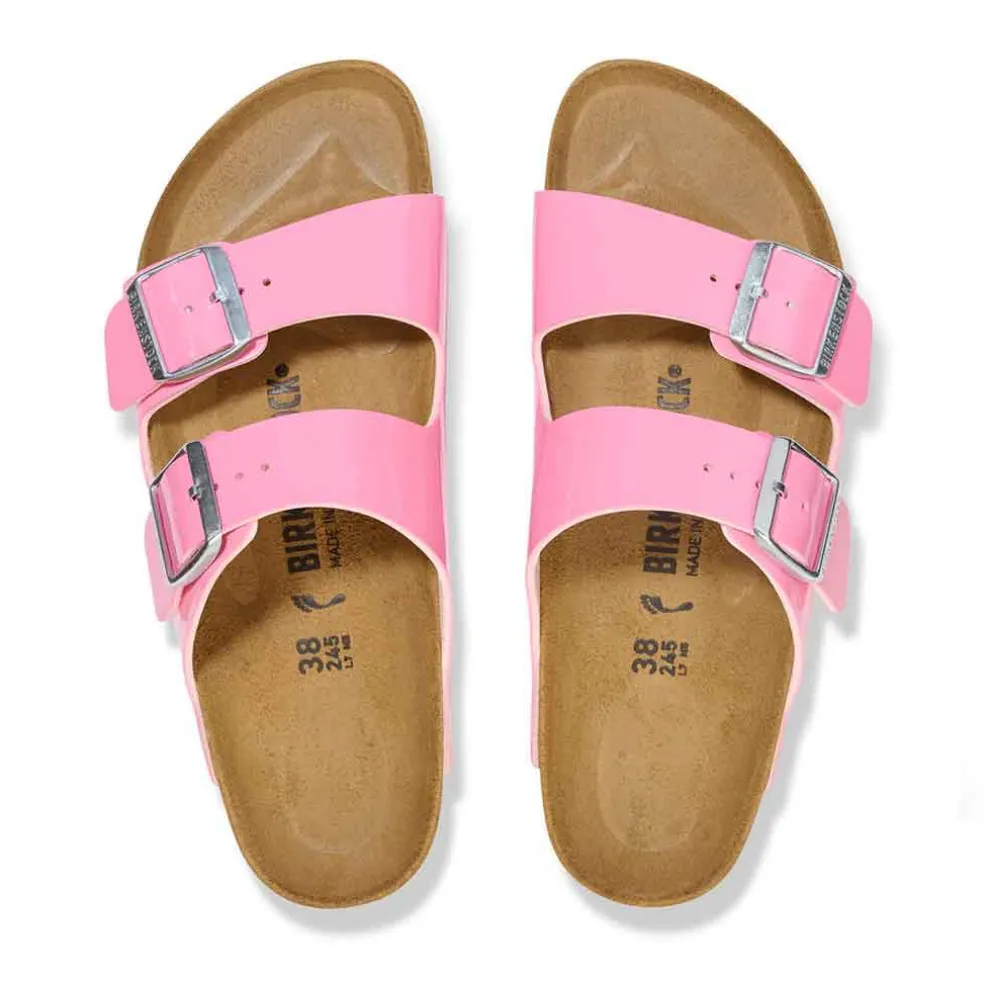 This Arizona double buckle sandal is a genuine classic. The Birko-flor model features the original Arizona footbed. Two individually adjustable straps and patent candy pink uppers make this a springtime staple with utility beyond sunny days (Birks and socks, anyone?).
