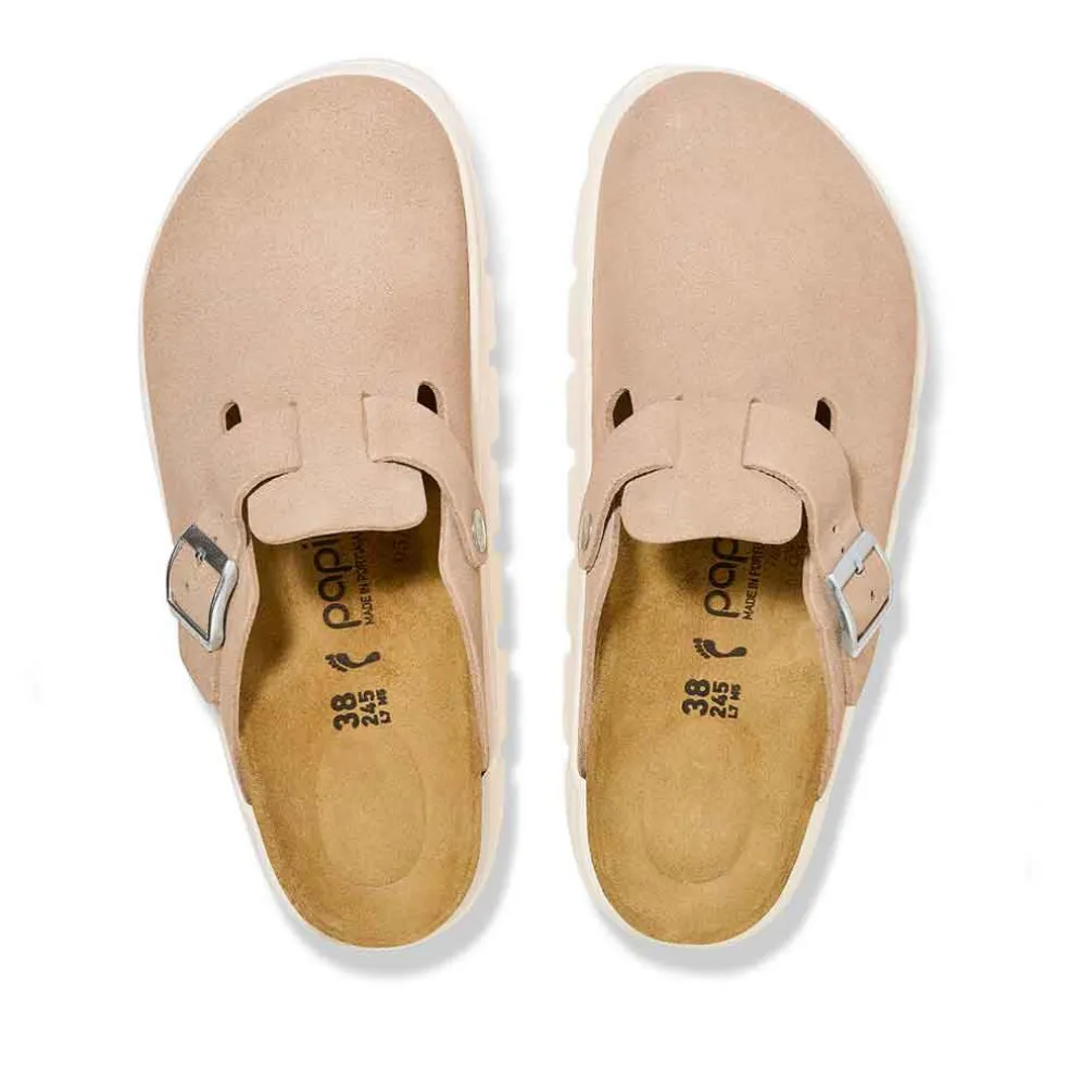 Birkenstock has become a household name, with many of their styles having their moments of viral fame and inspiring countless copycats. Rightfully so, because almost no one in the slide game has the comfort and quality for that price point. The Boston clog is a classic, offering close-toed protection from the elements in neutral sand suede. Features a thick white chunky platform sole.