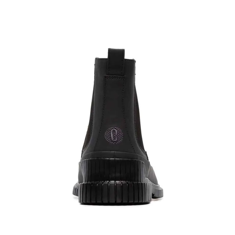 Camper shoe styles marry fashion and function with comfort technology. Fun colors, unique patterns make this collection a Sole Food favorite of staff and customers. Black leather uppers with a classic black Pix sole make this chelsea boot perfect for trekking through wet city streets. Features elasticated gussets and and a pull tab for fast transitions.