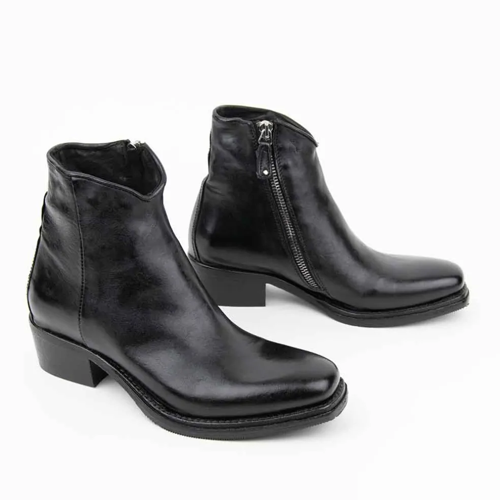 The rich supple leather and fine construction show off the lines of this simple yet striking shoe-boot. With a slight western flair, this bootie will become a must wear in your wardrobe.