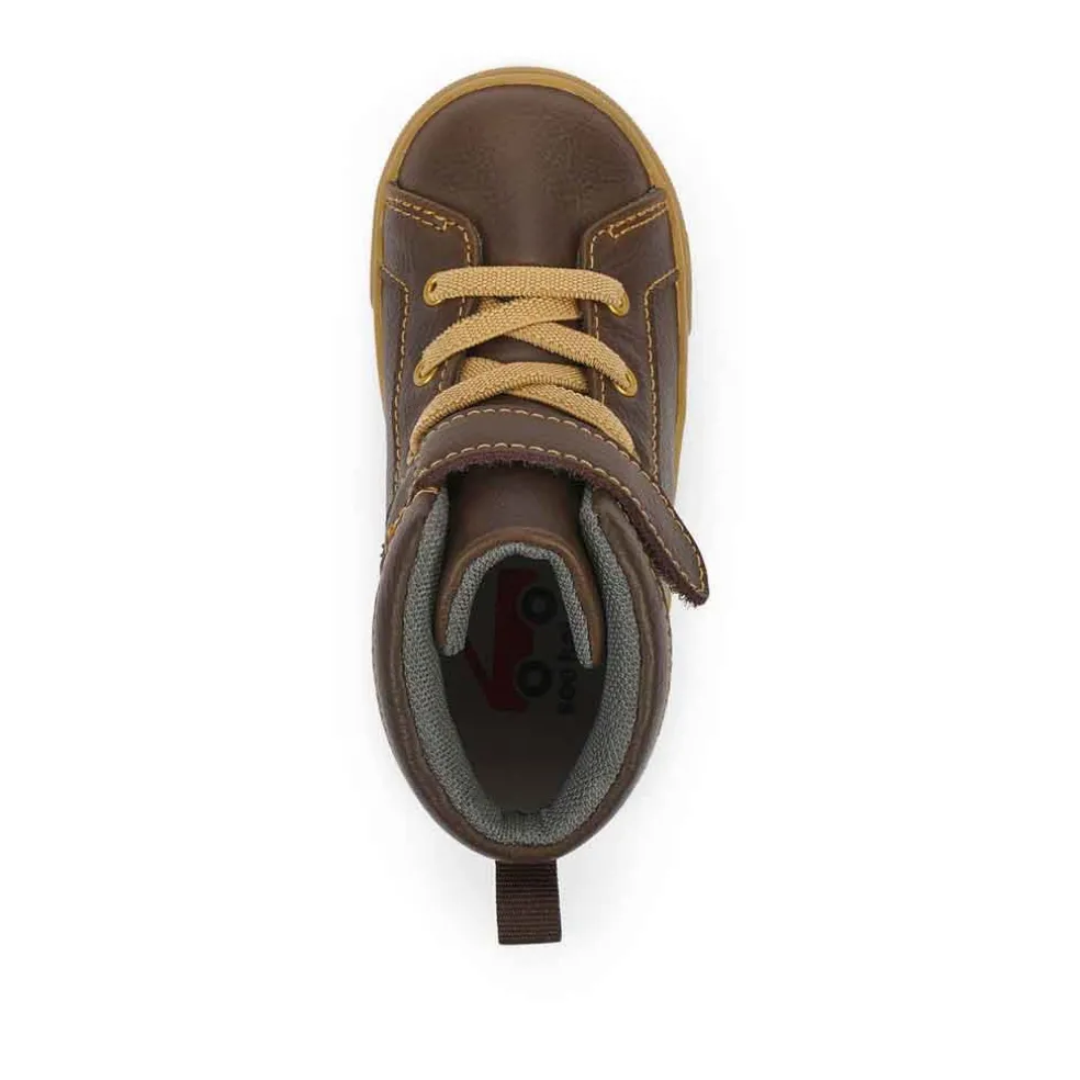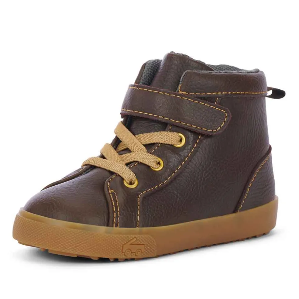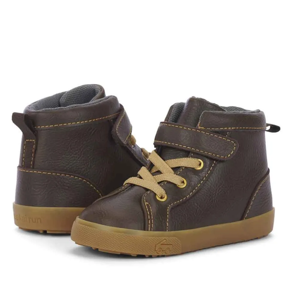 This classic brown leather sneaker/boot hybrid provides breathability on the inside, flexibility on the outside, and maximum comfort, making it the ultimate all-occasion pair. This sneaker features a brown leather upper, breathable recycled mesh lining, and a natural rubber outsole with great traction for play. See Kai Run’s wide toe box gives growing feet room to move.