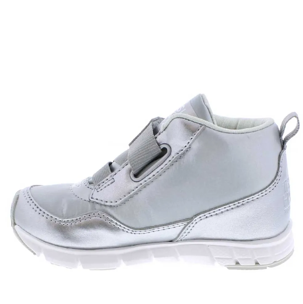 Tsukihoshi Tokyo high-top sneaker in silver metallic. Waterproof and machine washable. Available in US children sizes 7-1.