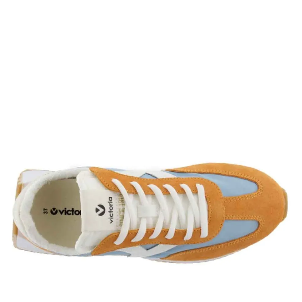 Victoria Cosmos a super light weight! We like the combination of sky-blue nylon and white faux leather with orange suede leather overlays. Non-slip waffle sole with cotton laces are the finishing touches. If you’re looking for comfort with design, this is the pair for you! Made in Spain.