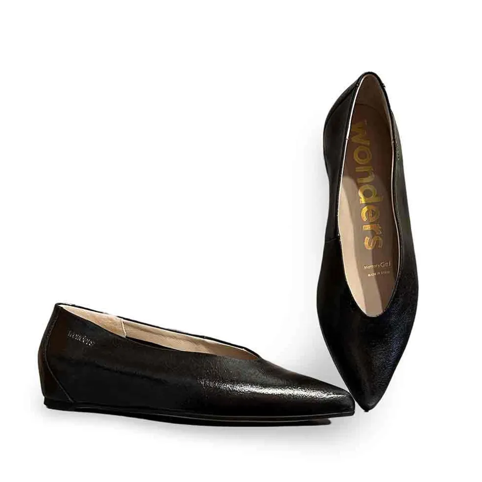 This Wonders flat is a versatile women’s shoe that seamlessly blends comfort and style. Crafted from high-quality leather, this model features a slight pointed toe, double stitching, and a u-shape vamp. Its slip-on design enhance its comfort and aesthetic appeal. Handcrafted in Spain, this timless flat shows the brand’s commitment to quality and artisanal craftsmanship.