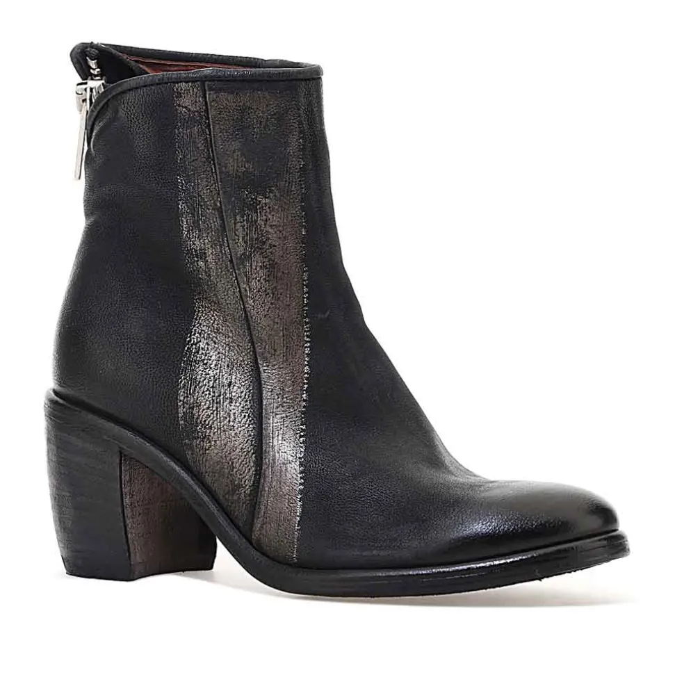 An A.S. 98 shoe is immediately identifiable as A.S 98 as soon as you see it. The Italian company’s handmade shoes are truly artistic- and quite comfortable. Unique design, soft leather uppers and a well-constructed sole make this brand a can’t-miss. This iconic pair features a splash of shiny metallic embossed and hand-burnished leather. Ricky’s sturdy block heel is delicately arched for a soft, architectural effect. The inner zipper is great not only for easy on/off – it wraps around the ankle for a dash of visual flair!