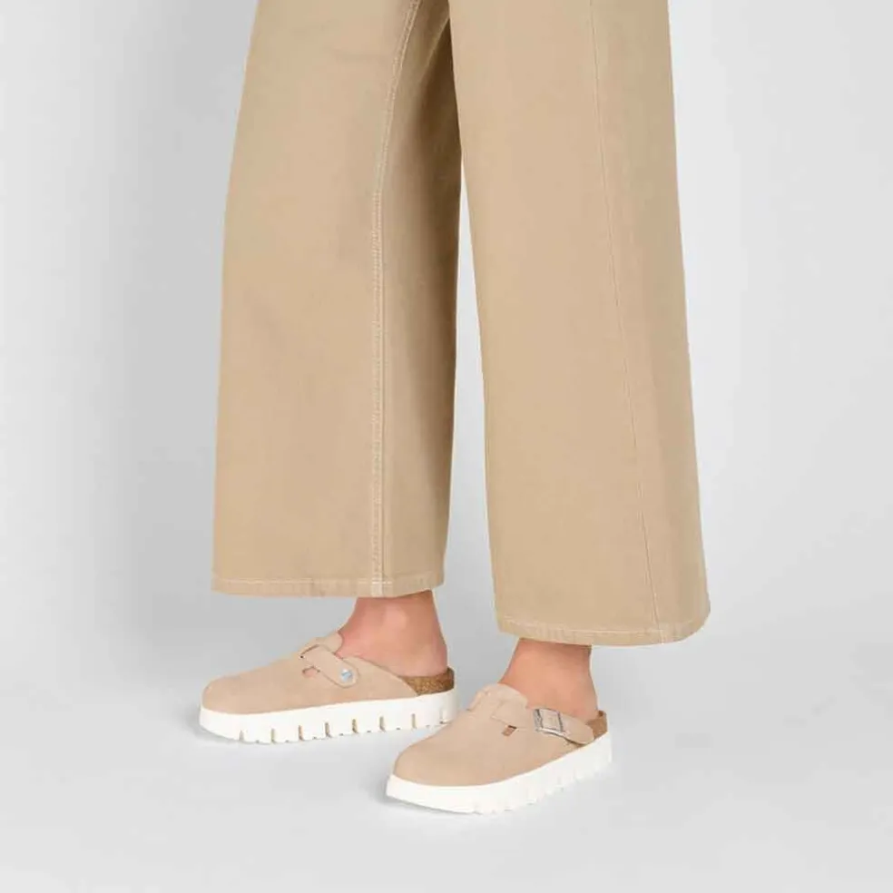 Birkenstock has become a household name, with many of their styles having their moments of viral fame and inspiring countless copycats. Rightfully so, because almost no one in the slide game has the comfort and quality for that price point. The Boston clog is a classic, offering close-toed protection from the elements in neutral sand suede. Features a thick white chunky platform sole.
