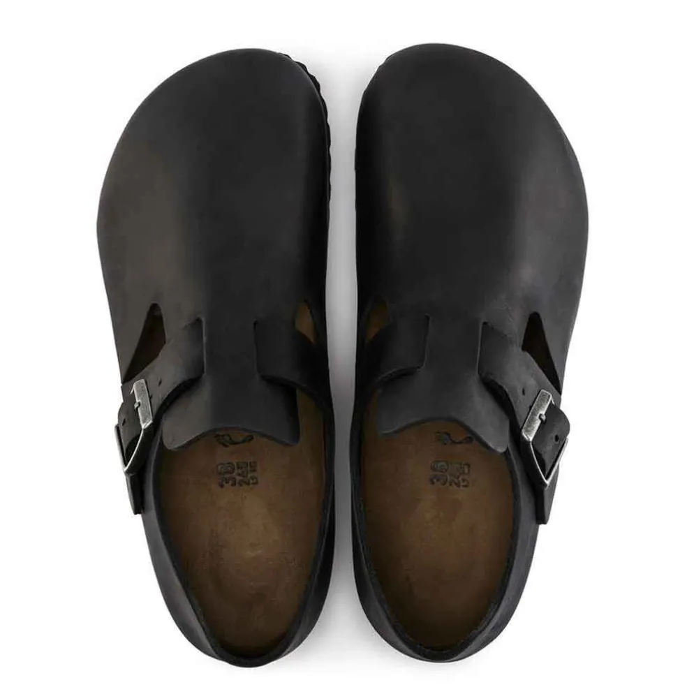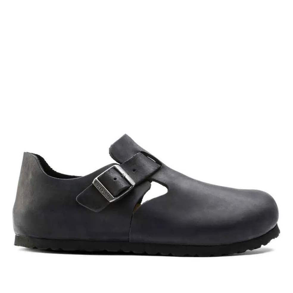 An original style from Birkenstock with clean lines and a fully enclosed form. An iconic footbed and black leather uppers provides comfort and support. With an easy fit and feel, the London offers protection and durability. Adjustable buckle strap.