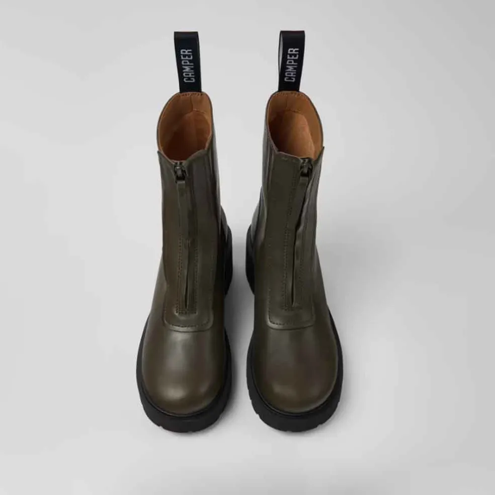 Introducing the Camper Milah Front Zip Boot in a stylish green color. This boot features a convenient front zip for easy on and off. Made with leather uppers and an EVA outsole, it provides both fashion and functionality for everyday wear.