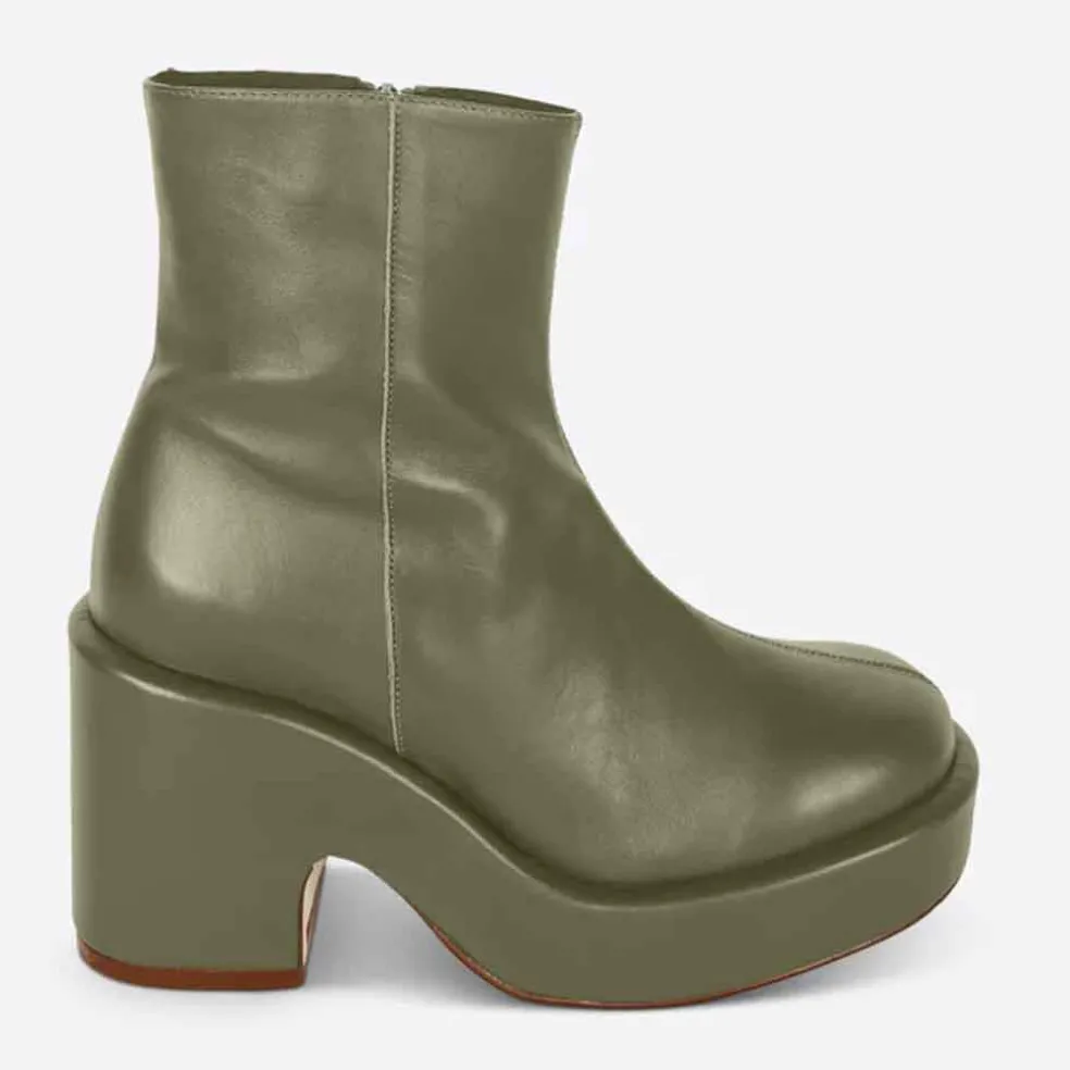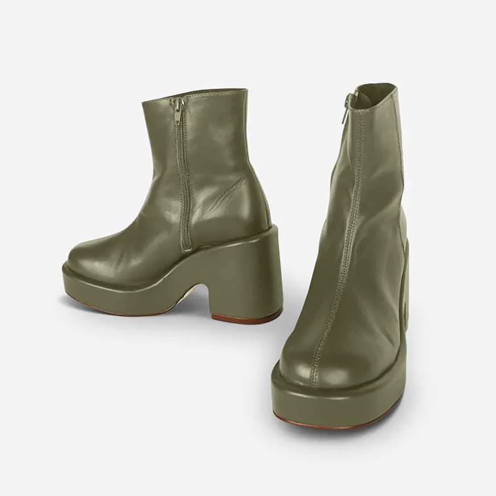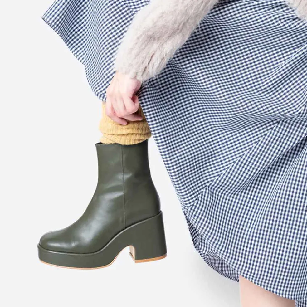 The Maria boot is chunky heaven. Features a hunter green wrapped leather platform sole and a split seam up the toe. An inside zip lends easy on/off. Minimal but makes a statement.