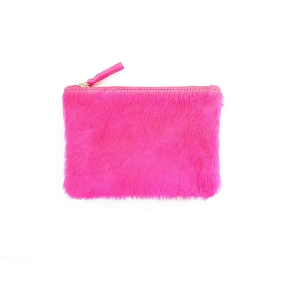Primecut’s cowhide zip pouches feature soft cowhide dyed in brilliant colors and patterns. A zipper keeps your belongings secure. This pink zip pouch fits everything you need for a night out- phone, keys, cards, a blush compact, and the 6 complementary Andes Mints you took from the bar.