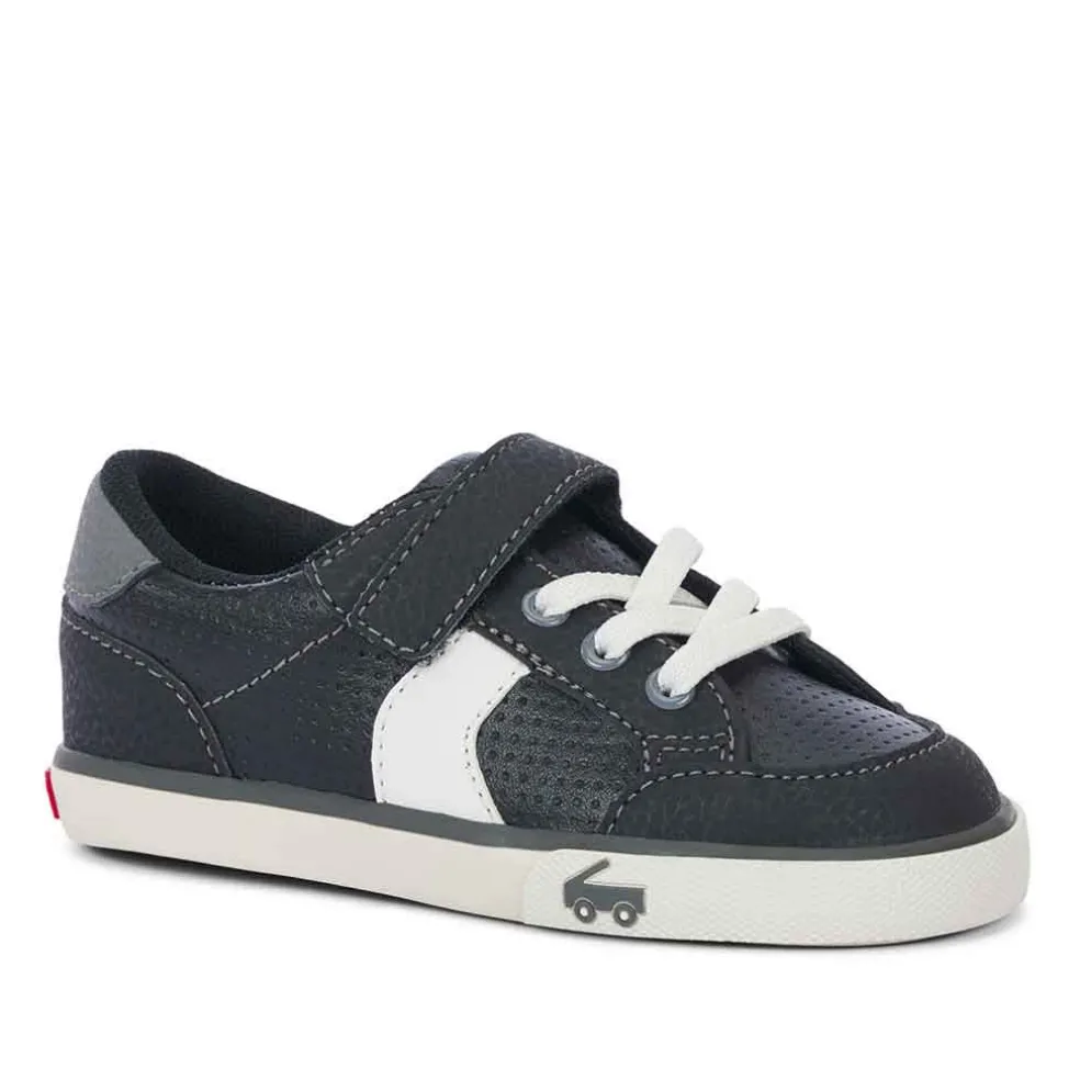 Featuring ultra flexible soles and big toe boxes, See Kai Run shoes are great for a wide age range, from kiddos taking tentative first steps to the squirmiest of grade-schoolers. Wide toe boxes are especially beneficial for the wiggle room that helps build strong feet. The Connor is a retro-inspired sneak with elastic laces easy for kids to slip on and off. Black leather uppers keep things fresh.