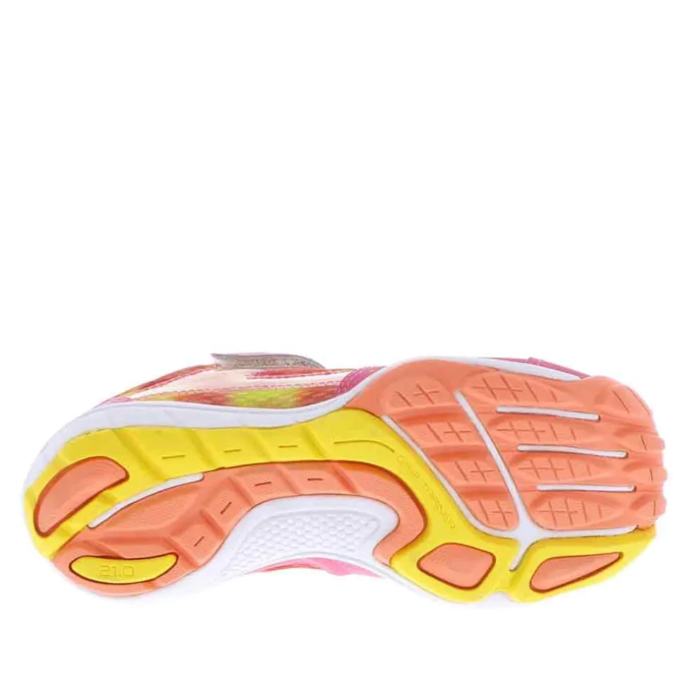 Tsukihoshi big kid sneaker, Mako in a yellow-pink tie-dye colorway with Fuchsia leather details. Velcro closure and rubber sole are no-brainers, perfect for everyday fun. Available in US children sizes 12-4.