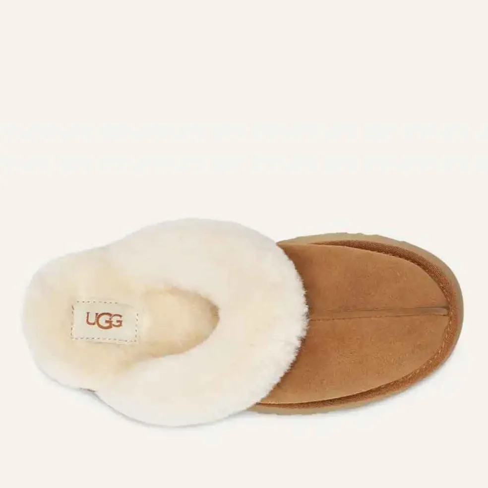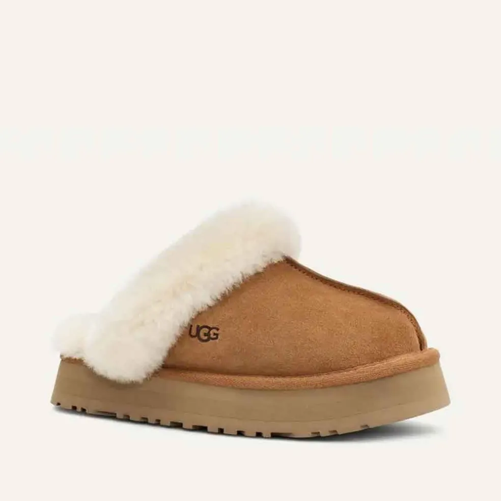 The Disquette brings slip-on comfort to new heights. The platform sole brings you from inside to outdoors with ease. A plush cream wool lining keeps your feet warm. In Ugg’s classic chestnut colorway.